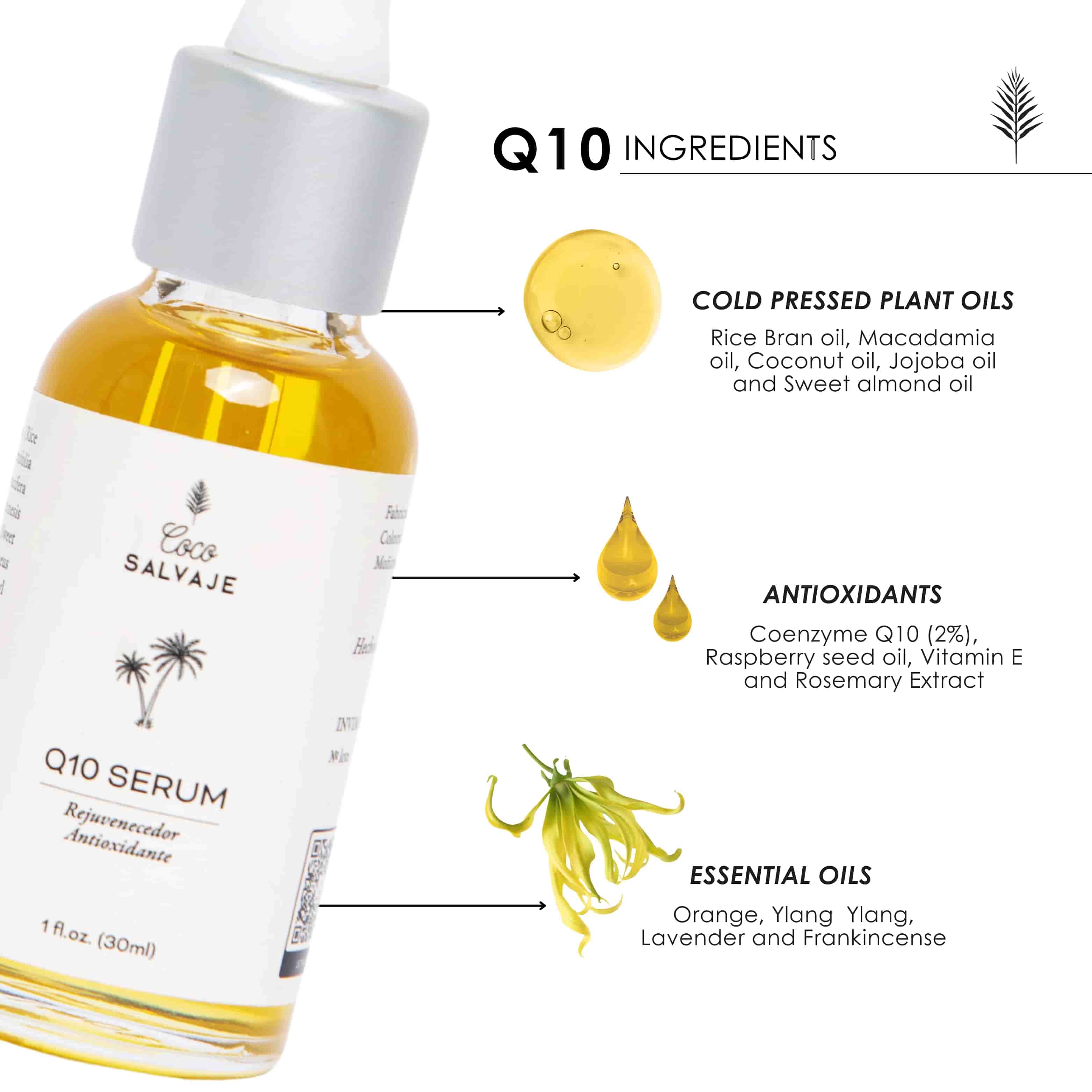 COCO SALVAJE's Q10 rejuvenating serum is composed of luxurious oils that deeply moisturize and nourish your skin. It contains antioxidants that help you neutralize free radicals and premature aging. It has a super powerful high-performance ingredient – Coenzyme Q10 at 2%. This star ingredient provides a large amount of energy to cells to help them produce collagen and elastin for a healthy plump skin. Coenzyme Q10 is present in every cell in our body, but after the age of 20 its quantity begins to decrease progressively. Coenzyme Q10 penetrates the cell layers of the skin and significantly reduces the depth of wrinkles and evens the skin tone.